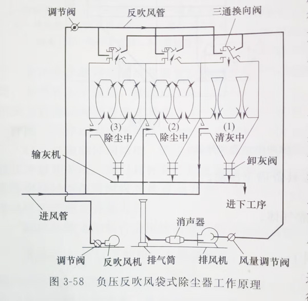 通往排氣總管被三通換向閥和調(diào)節(jié)閥的閥板都打開,這時反吹風機工作,反吹風吹向濾袋進行與過濾方向相反的吹洗,濾袋上的粉塵層被吹落,清灰完畢。清灰后的沉降過程是關(guān)閉調(diào)節(jié)閥,讓濾袋既無過濾過程又無反吹清灰過程,而是處于靜止階段,使從濾袋上吹落的粉塵沉降在灰斗張總,之后換向閥換向,沉降過程停止再進入過濾過程。