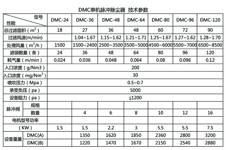 DMC型脈沖式單機(jī)布袋除塵器技術(shù)參數(shù)表(附圖一)